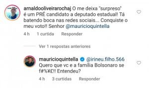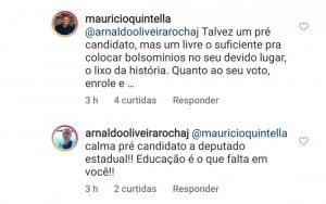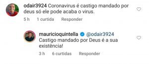 Entre as respostas mais interessantes foi quando um internauta disse que a covid foi mandada como castigo de Deus. Quintella rebateu: “Castigo mandado por Deus é a sua existência”. Bem, a resposta não deixou de ser engraçada.