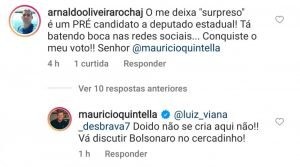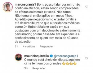 Ao postar no Instagram uma foto dos filhos do presidente Bolsonaro se vacinando, Quintella começou a responder os internautas que criticaram a vacinação.