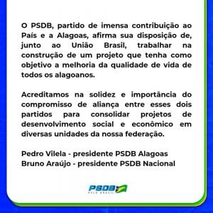 “O PSDB, partido de imensa contribuição ao país e a Alagoas, firma sua disposição de, junto à União Brasil, trabalhar na construção de um projeto que tenha como objetivo a melhoria da qualidade de vida de todos os alagoanos. Acreditamos na solidez e importância do compromisso de aliança entre esses dois partidos para consolidar projetos de desenvolvimento social e econômico em diversas unidades da nossa federação”.