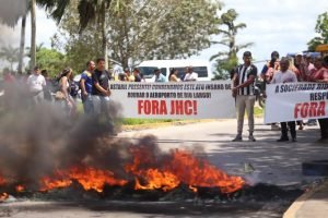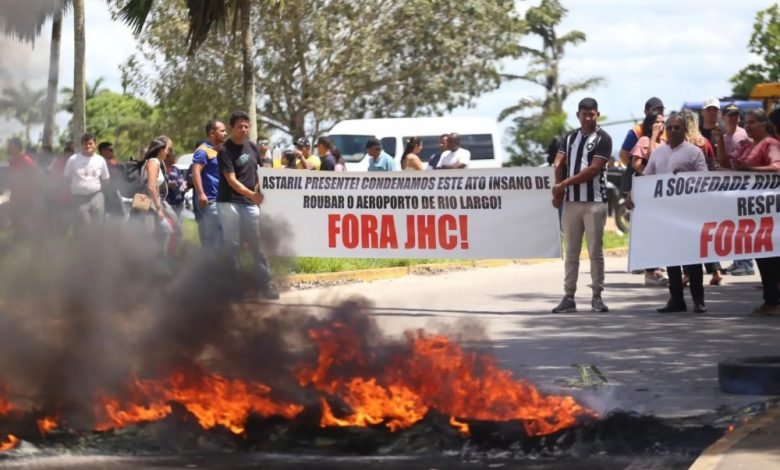 Moradores, taxistas, comerciantes e empresários de Rio Largo bloquearam a entrada do Aeroporto Zumbi dos Palmares na manhã desta quarta-feira (16) com o objetivo de impedir a “retirada do aeroporto do município”. Com cartazes e faixas, os moradores escreveram: “Fora JHC, o aeroporto é nosso”.