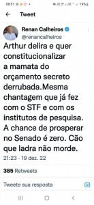 “Arthur delira e quer constitucionalizar a mamata do orçamento secreto derrubada. Mesma chantagem que já fez com o STF e com os institutos de pesquisa. A chance de prosperar no Senado é zero. Cão que ladra não morde”, publicou o senador.