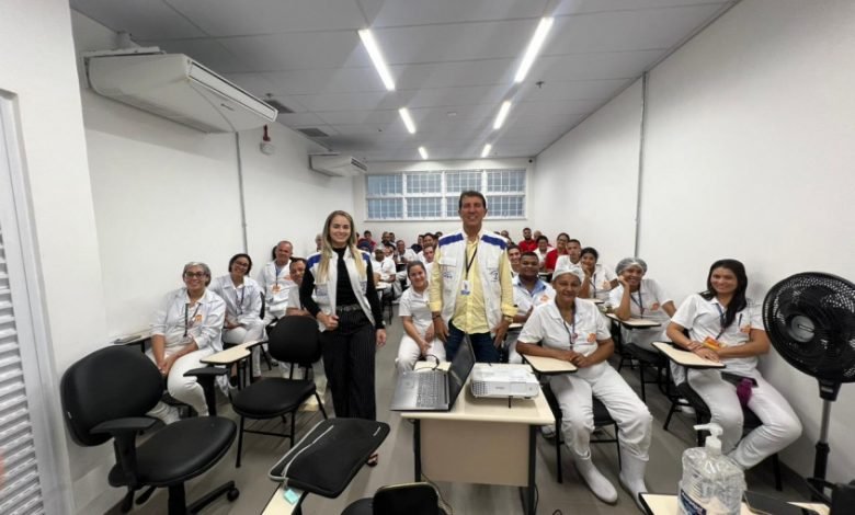 A Vigilância Sanitária (Visa) continua promovendo capacitações direcionadas a empreendimentos locais sobre produção, armazenamento e comercialização de produtos alimentícios. Na última quarta-feira (4), o órgão ofertou qualificação para 41 funcionários da rede de Supermercados Assaí. As orientações foram apresentadas pelo coordenador geral da Vigilância Sanitária, Airton Santos, e pela nutricionista e gerente de alimentos da Visa Vitorya Sarah.