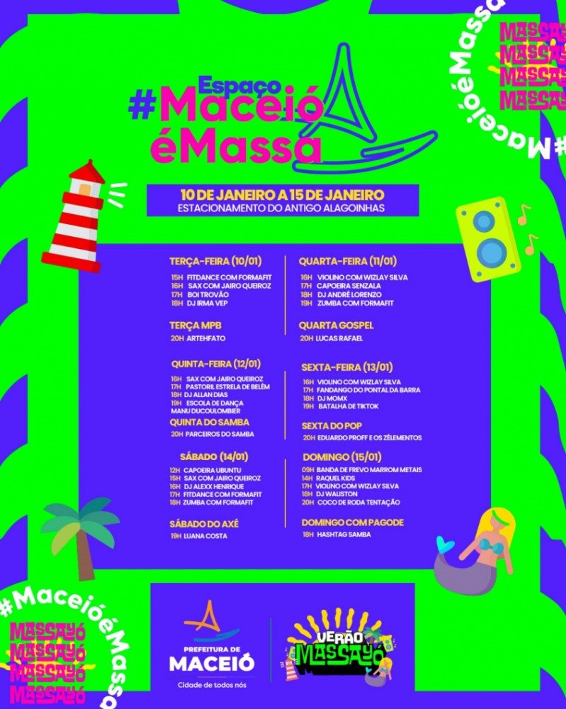 A programação do Espaço Maceió é Massa, do Verão Massayó, segue com apresentações para todos todos os públicos. Levando muita animação, cultura e lazer para a orla da Ponta Verde, no estacionamento do antigo Alagoinhas.