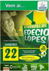 “Edécio Lopes” vai liderar a abertura das prévias carnavalescas multiculturais no domingo, dia 22 de janeiro, a partir das 10h30 na orla da Ponta Verde. A concentração será na Praça Geruza Malta.
