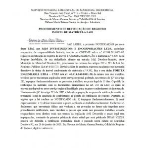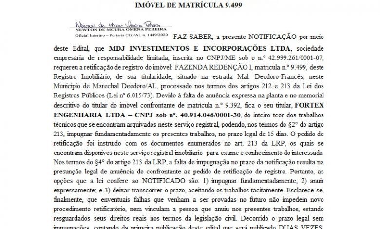 EDITAL: MDJ Investimentos pede retificação de registro de imóvel Confira edital na íntegra: edital retificação FORTEX ENGENHARIA LTDA