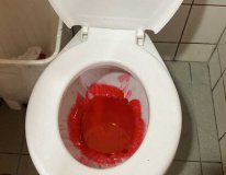 Durante a inspeção, foi realizado um teste com corante. O produto foi colocado em vasos sanitários da escola e, ao ser acionada a descarga, o mesmo corante, de coloração vermelha, saiu na rede de drenagem da Rua Hélio Pradines, confirmando o despejo irregular de efluentes.