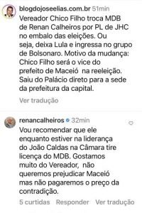 Recentemente, o vereador por Maceió Chico Filho resolveu trocar o MDB de Renan Calheiros, pelo PL de João Henrique Caldas.