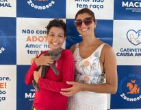 Karina Farias estava passeando com o filho na orla, e ao visitar a estrutura da feira decidiu realizar a adoção de um gato. O felino havia sido resgatado e estava sob os cuidados do tutor temporário, João Vasconcelos. A adotante elogiou o atendimento que recebeu na feira.
