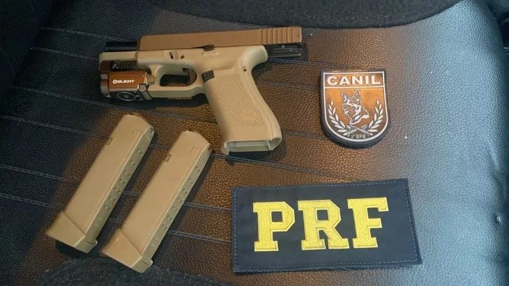 Durante as fiscalizações de praxe, foi encontrada no interior do carro uma arma de fogo Glock, modelo G19X, 9mm com 34 munições do mesmo calibre.