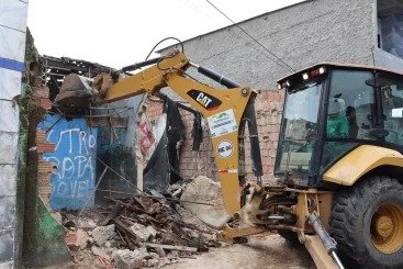 Um imóvel abandonado e com risco de desabamento foi demolido pelas equipes da Secretaria Municipal de Segurança Comunitária e Convívio Social (Semscs).