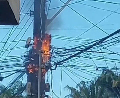 Imagens que circulam nas redes sociais mostram moradores apagarndo as chamas jogando água no poste