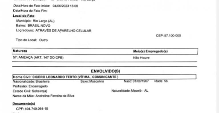 Cícero Leonardo Terto, conhecido por suas denúncias contra políticos e pessoas influentes do município de Rio Largo, em Alagoas, registrou um Boletim de Ocorrência nesta quarta-feira, 21, no 12º Distrito Policial, junto à Polícia Civil de Alagoas. Ele denunciou um suposto plano arquitetado por autoridades para assassinar sua pessoa. Segundo Terto, o plano estava previsto para ser executado no dia 1º deste mês, data de seu aniversário, porém foi abortado porque ele não se expôs em público, conforme ele afirma. As informações sobre o complô foram mencionadas em um vídeo divulgado pelo WhatsApp, que posteriormente vazou e circulou nas redes sociais dos moradores da cidade.