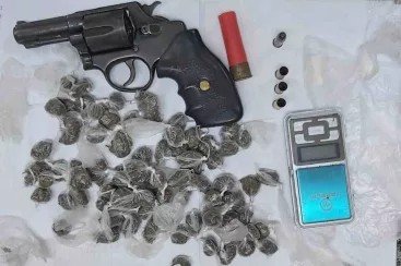 A PM apreendeu com o acusado 83 bombinhas de maconha, um revólver calibre 38 com brasão da PRF, três munições deflagradas e uma intacta, uma balança de precisão e uma cápsula de calibre .12 e sacos para embalar entorcepentes.