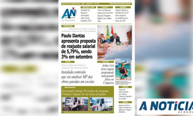 JORNAL A NOTÍCIA DIGITAL – VALORIZAÇÃO: Paulo Dantas apresenta proposta de reajuste salarial de 5,79%, sendo 3% em setembro Ficou acertado entre governo e sindicatos a possibilidade de antecipação dos 2,79% para dezembro JAND-021