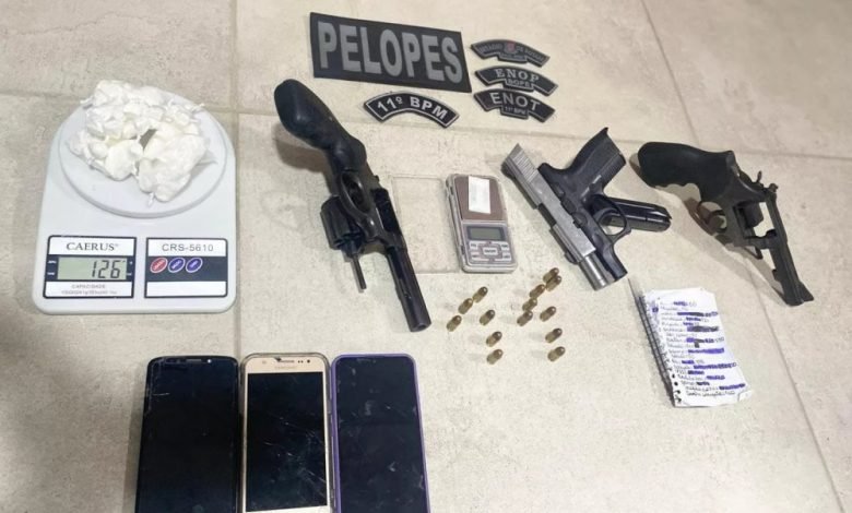 A identidade da mulher não foi informada, mas em sua residência foi encontrada três armas de fogo, sendo dois revólveres e uma pistola, além de 126 gramas de cocaína, uma balança de precisão e três aparelhos de celular. Também foi apreendido uma caderneta com informações sobre o tráfico de drogas na região.