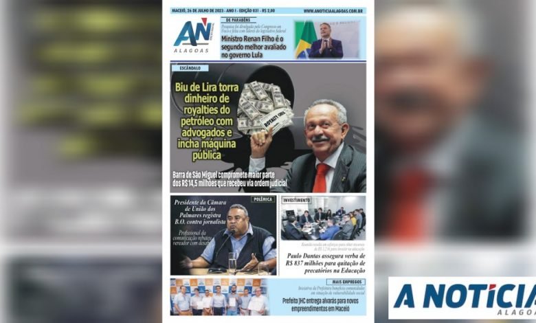 JORNAL A NOTÍCIA DIGITAL – ESCÂNDALO: Biu de Lira torra dinheiro de royalties do petróleo com advogados e incha máquina pública Barra de São Miguel compromete maior parte dos R$ 14,5 milhões que recebeu via ordem judicial JAND-031