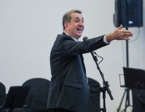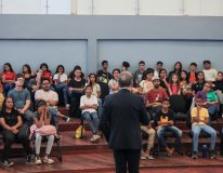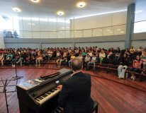 Durante a apresentação, o regente ensinou os sons dos instrumentos para os alunos, além de incentivar os estudantes a tocarem os instrumentos e até conduzirem o coral.