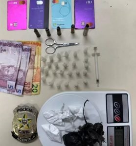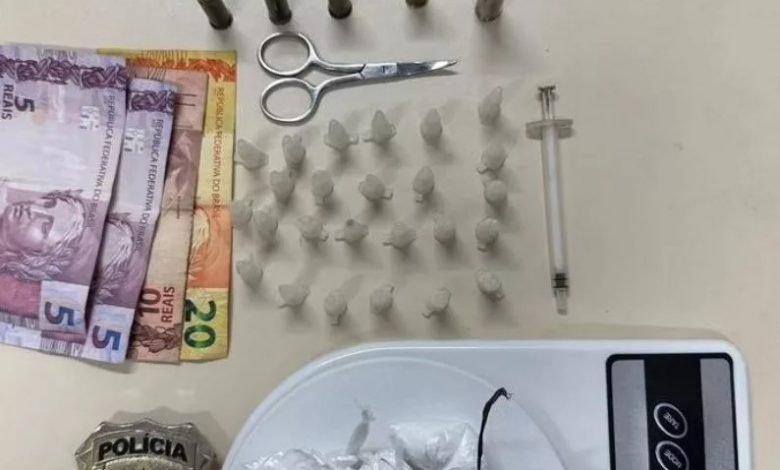A mulher foi abordada e foram encontrados na sacola 25 pinos de cocaína, quatro trouxinhas de cocaína, dinheiro trocado, quatro munições de revólver calibre 38 e uma munição de fuzil. A droga apreendida está avaliada em aproximadamente R$ 10 mil.