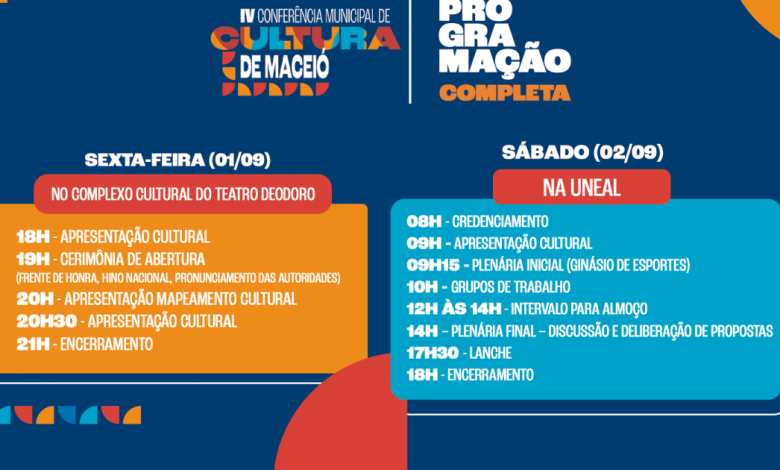 A conferência contará com uma série de atividades, como debates, palestras e apresentações culturais, que abordarão questões como valorização da democracia e direito à cultura, acesso à cultura, preservação do patrimônio histórico, economia criativa e fomento às atividades culturais em Maceió, entre outros assuntos relacionados.
