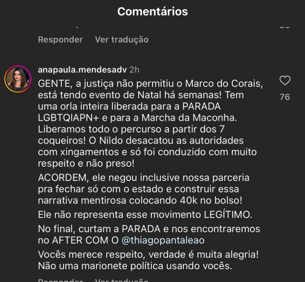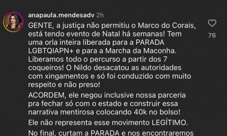 Em mais polêmica envolvendo a Prefeitura de Maceió, a secretária da Mulher, Ana Paula Mendes, lançou críticas públicas contra o Movimento LGBTQIAPN+, na tentativa de prejudicar a Parada Gay. Em diversas postagens no Instagram, sua postura agressiva gerou questionamentos do comportamento à função pública que ocupa.