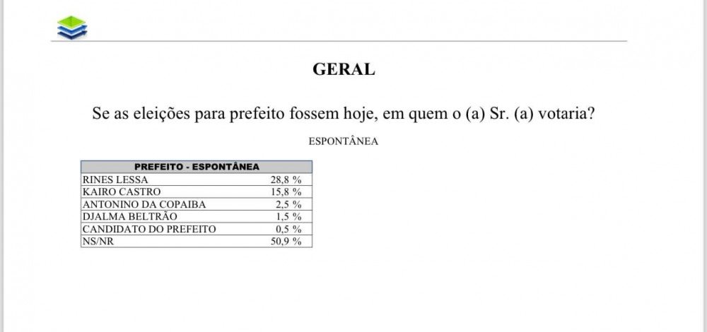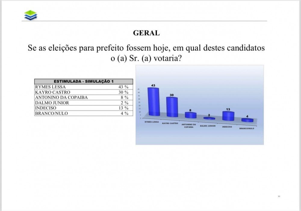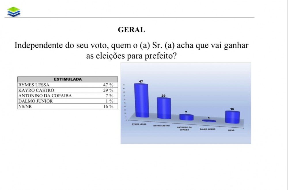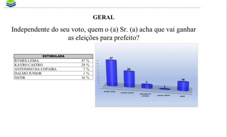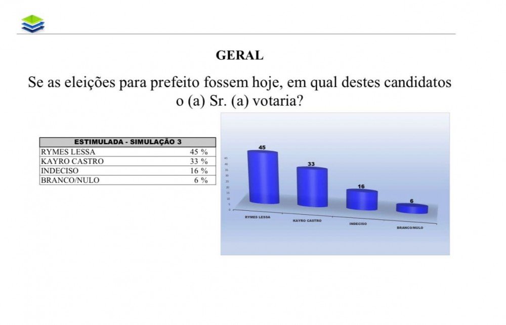 Conforme a pesquisa, Rymes lidera as intenções de voto tanto na espontânea, quanto na estimulada.