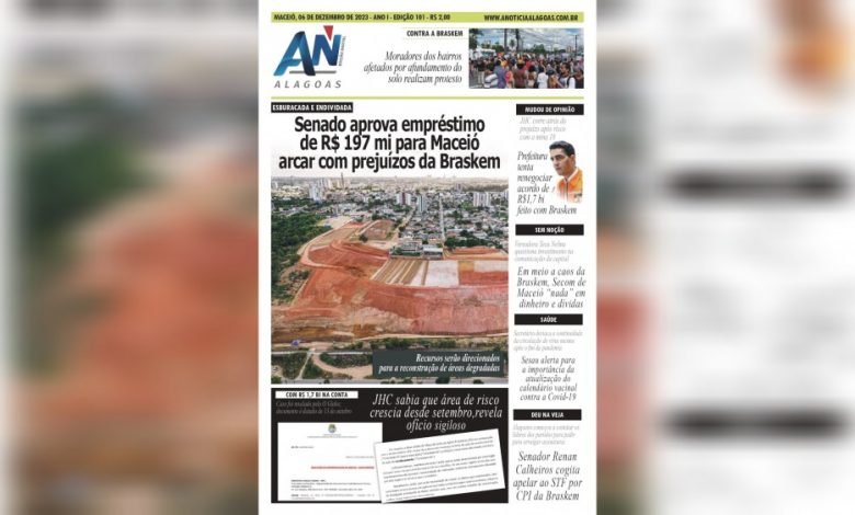 JORNAL A NOTÍCIA DIGITAL – ESBURACADA E ENDIVIDADA! Senado aprova empréstimo de R$197 mi para Maceió arcar com prejuízos da Braskem Recursos serão direcionados para a reconstrução de áreas degradadas JAND-101
