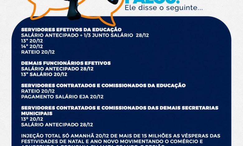 Além do 13° salário a todos os funcionários sejam efetivos, contratados ou comissionados, também será feito maior rateio jamais visto na região com mais de Dez Milhões de Reais além do 14º salário aos profissionais da educação .