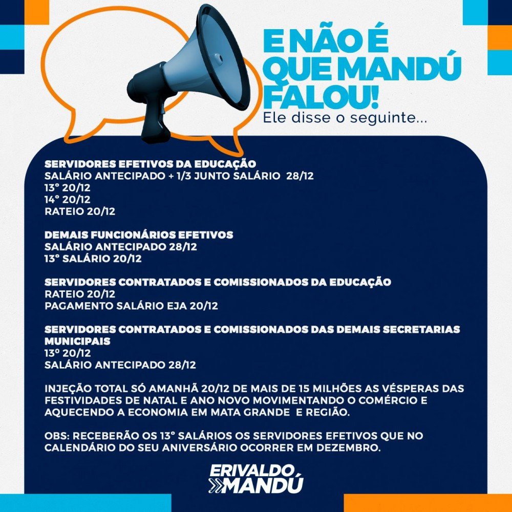 Na noite de ontem (19), o prefeito de Mata Grande Erivaldo Mandú, utilizou das suas redes sociais para anunciar algo inédito na história da cidade, em live que em sua abertura contava com mais de 1.500 participantes anúncio um incremento na economia de mais de 15 Quinze Milhões de Reais, aquecendo o comércio de produtos e serviços e fazendo economia da cidade e região efervescer.