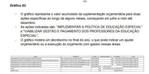 Mais grave é que a prefeitura de Maceió reduziu o orçamento para a educação especial ao longo de 2023, como mostra uma tabela sobre o valor acumulado da suplementação orçamentária para duas ações específicas ao longo de alguns meses. A tabela revela um decréscimo no final do ano de R$ 12,8 milhões, indicando a falta de compromisso da gestão com a educação especial.