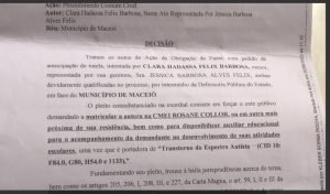 Jessica buscou a Justiça em junho de 2023 para garantir a vaga para sua filha autista. No entanto, a Creche Rosane Collor e a Secretaria Municipal de Educação (Semed) não abriram a vaga, mesmo com a decisão judicial em mãos. A diretora da instituição informou que o documento não garantiria a matrícula de Clara.