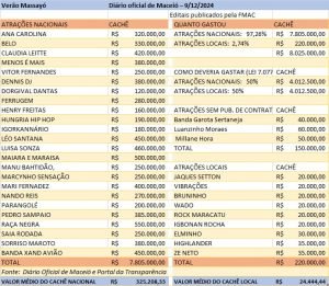 A soma dos cachês atinge aproximadamente R$ 8,2 milhões, com R$ 7,8 milhões destinados a artistas nacionais, R$ 220 mil a locais e outros R$ 150 mil (estimados) a três artistas cujos contratos não foram publicados no Diário Oficial de Maceió até segunda-feira, 15. Enquanto isso, os gastos com estrutura, segurança, serviços e propaganda totalizam R$ 6,75 milhões. O custo apurado do evento, até o momento, eleva-se a exorbitantes R$ 14,97 milhões.