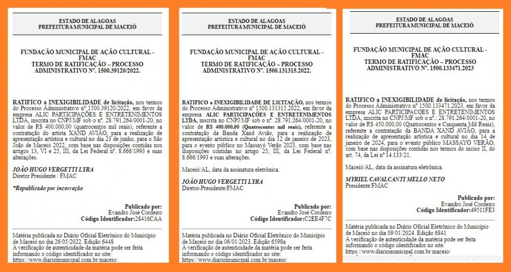 Além disso, a relação entre Xand Avião e o prefeito tem se mostrado lucrativa para o artista, que já realizou três apresentações em Maceió nos últimos 18 meses, totalizando um cachê de R$ 1,25 milhão pago com dinheiro público. Esses valores incluem apresentações no São João de 2022 e no Verão Massayó de 2023, ambos com cachês de R$ 400 mil, e a última apresentação em 2024, com um cachê ligeiramente maior, de R$ 450 mil. O montante total é considerado um dos mais altos já pagos pela prefeitura de Maceió a um artista em sua história.