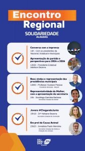 O Solidariedade tem a honra de anunciar o Encontro Regional do partido, que ocorrerá na quinta-feira (29/02), a partir das 13h, no Hotel Ritz Lagoa da Anta, em Maceió. O evento contará com a participação de personalidades de destaque no cenário político local e nacional.