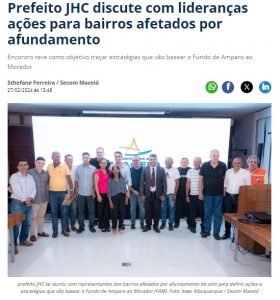 O prefeito João Henrique Caldas, o JHC (PL), segundo informações da Secretaria de Comunicação de Maceió, reuniu-se nessa terça-feira (27) com representantes dos bairros afetados pelo afundamento do solo para discutir ações do Fundo de Amparo ao Morador (FAM).