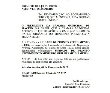 Uma lei municipal, aprovada em fevereiro de 2022 pela Câmara Municipal de Maceió, determinou que a UPA da Santa Lúcia, inaugurada na última segunda-feira (11), fosse denominada UPA Ministro Guilherme Palmeira, em homenagem ao político que foi prefeito de Maceió, governador de Alagoas e ministro do TCU. No entanto, o prefeito João Henrique Caldas, o JHC (PL), optou por ignorar essa legislação, apagando assim parte da história.