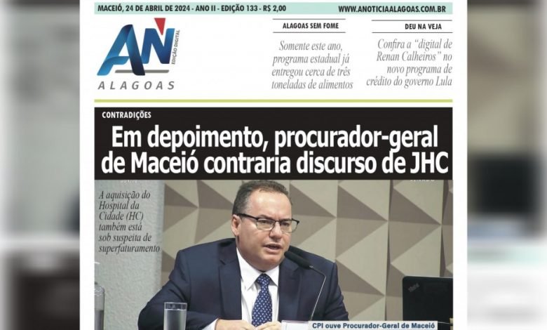 JORNAL A NOTÍCIA DIGITAL – CONTRADIÇÕES! Em depoimento, procurador-geral de Maceió contraria discurso de JHC A aquisição do Hospital da Cidade (HC) também está sob suspeita de superfaturamento JAND-133