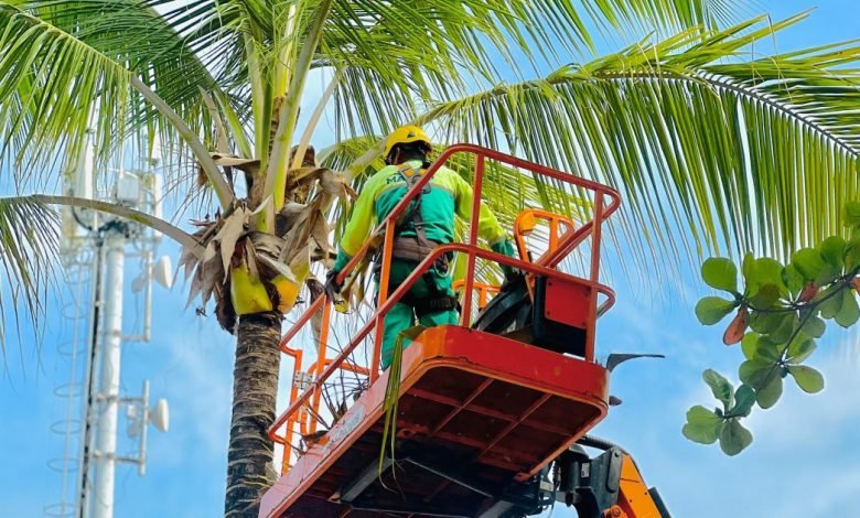 MACEIÓ – Alurb intensifica limpeza de coqueiros na orla de Maceió devido aos danos causados por ventos fortes nos últimos meses.