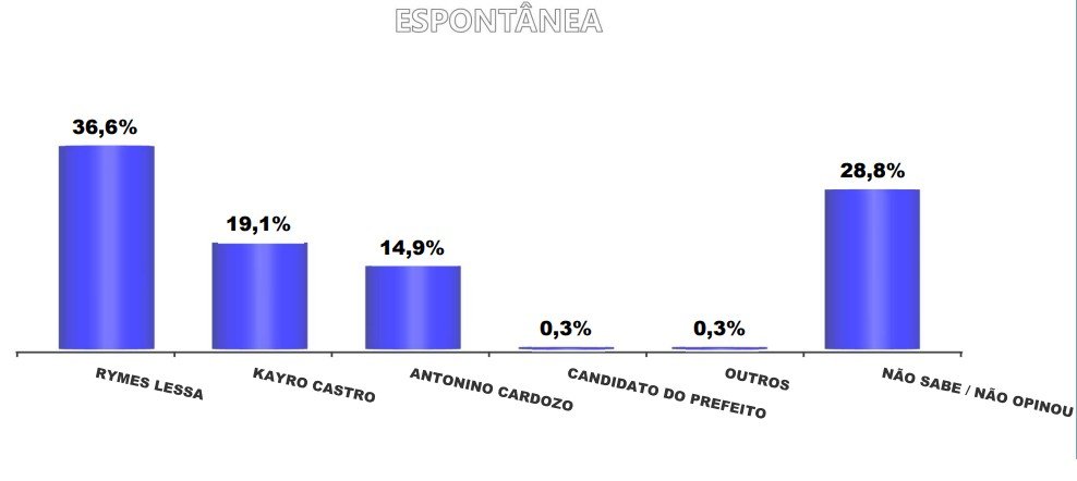 Em relação às intenções de voto para a próxima eleição, no cenário espontâneo, Rymes Lessa lidera com 36,6% das preferências, seguido por Kayro Castro com 19,1% e Antonino Cardozo com 14,9%.