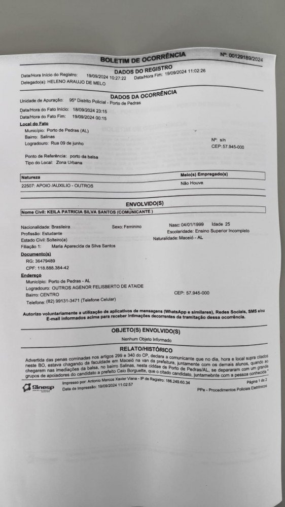 Desta vez, a vítima foi um grupo de estudantes que voltavam para Porto de Pedras, por volta das 21h de quarta-feira (18/9), após mais um dia de aula numa faculdade em Maceió, quando foram emboscados numa rua, próxima ao local onde, aparentemente, acontecia uma carreata patrocinada pelo pai do candidato Caio, conhecido por Boi Lambão.