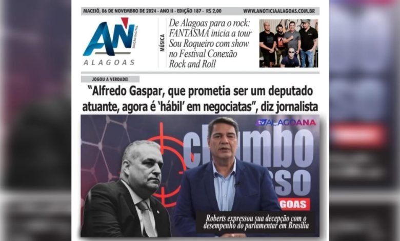 JORNAL A NOTÍCIA DIGITAL – JOGOU A VERDADE! “Alfredo Gaspar, que prometia ser um deputado atuante, agora é ‘hábil’ em negociatas”, diz jornalista Roberts expressou sua decepção com o desempenho do parlamentar em Brasília NOV-187