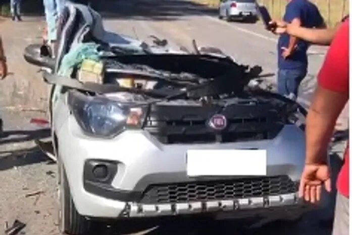 Imagens do acidente mostram a traseira e a parte superior do veículo completamente destruídas, com o homem preso no banco do motorista, exibindo o rosto ensanguentado. Para realizar o resgate da vítima, o Corpo de Bombeiros mobilizou quatro viaturas com 13 militares, que precisaram cortar o que restou do teto do carro para conseguir retirar o motorista.