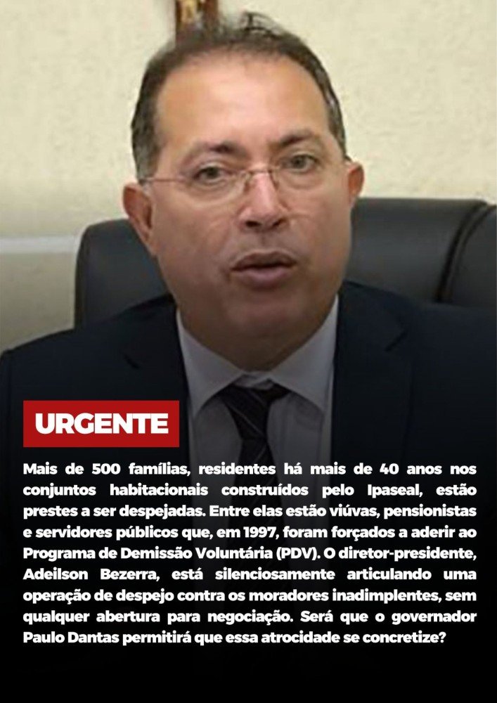 Nesta quinta-feira, 5, o presidente do IPASEAL, Adeilson Bezerra, se viu no centro de uma polêmica envolvendo uma fake news que ganhou força nas redes sociais. A informação falsa sugere que ele estaria articulando um despejo sem negociação prévia contra cerca de 500 moradores de apartamentos antigos, todos inadimplentes. Bezerra não hesita em desmentir tais afirmações, que ele considera irresponsáveis e sem fundamento.