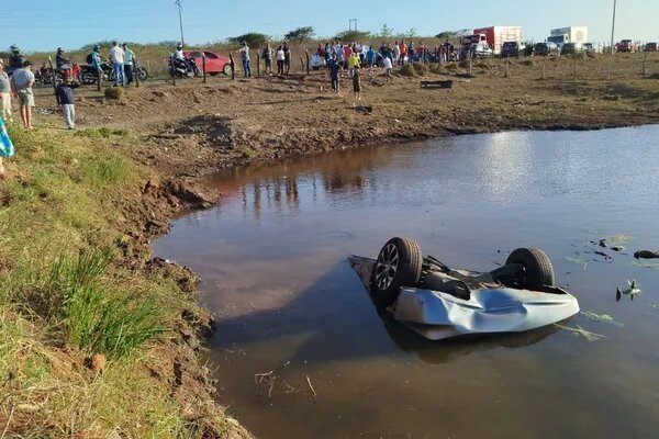 Carro é encontrado dentro de açude após acidente em Lagoa da Canoa, interior de Alagoas, no Nordeste do Brasil.