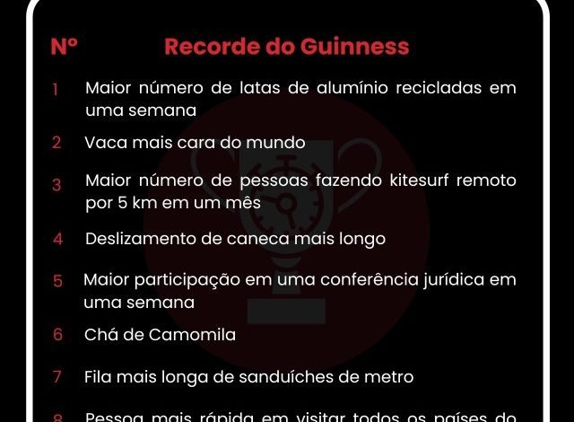 Brasileiros quebram recordes no Guinness 2024: reciclagem de latas, vaca mais cara, kitesurf e deslizamento de caneca. Conquistas incluem maior conferência jurídica, coleção de moldes dentais e fila de sanduíches.