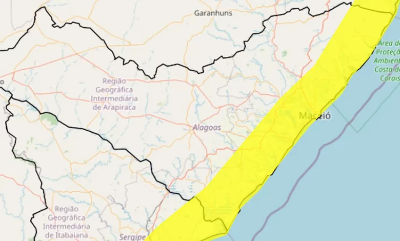 Além do alerta vermelho, o Inmet também emitiu um alerta amarelo para 91 cidades alagoanas, onde o acumulado de chuvas pode chegar a 50 mm/dia. Os efeitos esperados nesses locais são mais brandos, com possibilidade de alagamentos, mas sem risco de ventos intensos.
