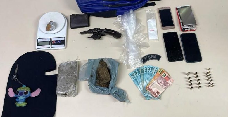 No interior do imóvel, foram encontrados um revólver calibre .32, 540 gramas de maconha e cocaína, uma balança de precisão, 22 munições e quatro celulares. Os suspeitos, com idades de 18, 30 e 32 anos, foram encaminhados à delegacia de Santana do Ipanema para os procedimentos legais.