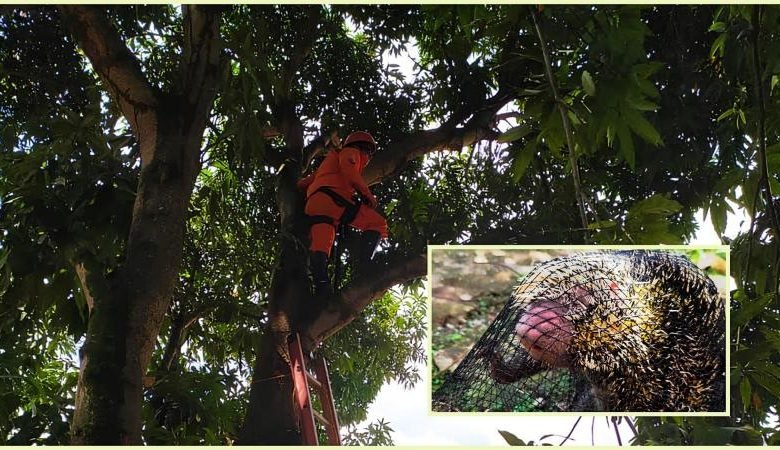 Ao chegar no local, uma equipe de resgate composta por três militares utilizou equipamentos apropriados e técnicas especializadas para efetuar o salvamento com sucesso. O porco-espinho, um animal de pequeno porte, foi retirado da árvore e entregue aos cuidados do Batalhão de Polícia Ambiental (BPA) para avaliação e cuidados posteriores.