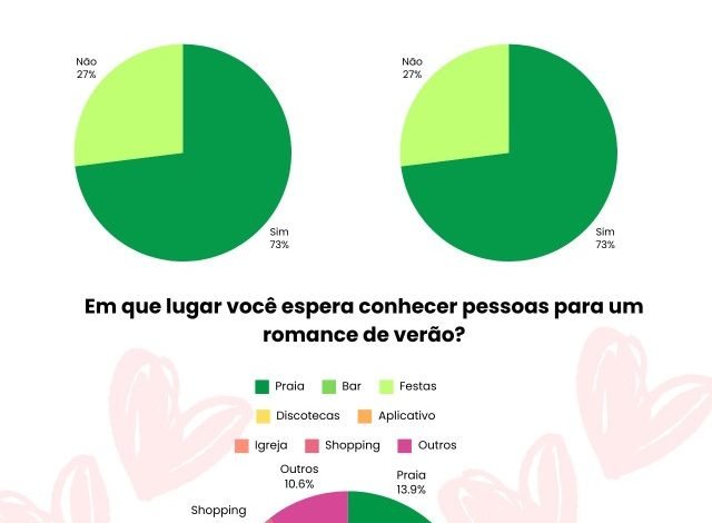 Os lugares mais comuns para encontrar um romance de verão incluem aplicativos de encontros (15,96%), bares (15,83%), festas (14,33%) e praias (13,90%).