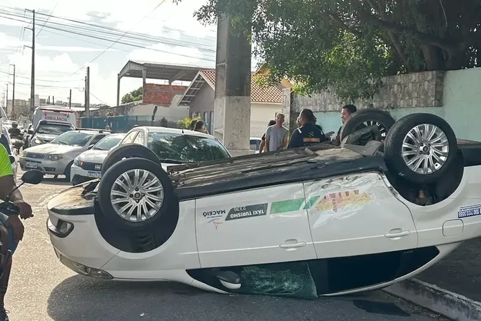 Acidente de táxi deixa três feridos após capotamento na Avenida Brasil em Maceió