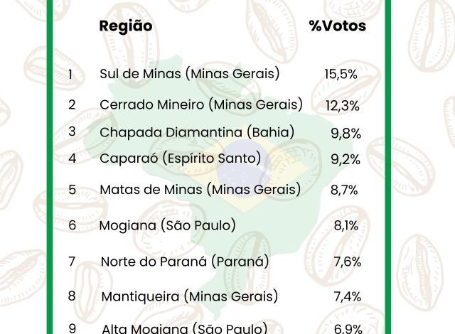 A Alta Mogiana recebeu 6,90% dos votos e é famosa por seus cafés com corpo médio, acidez equilibrada e notas de chocolate e frutas cítricas. A região é uma das mais tradicionais na produção de café no Brasil.